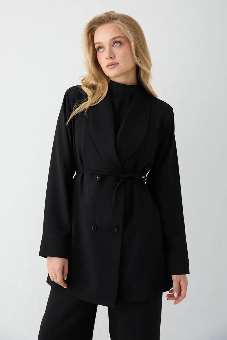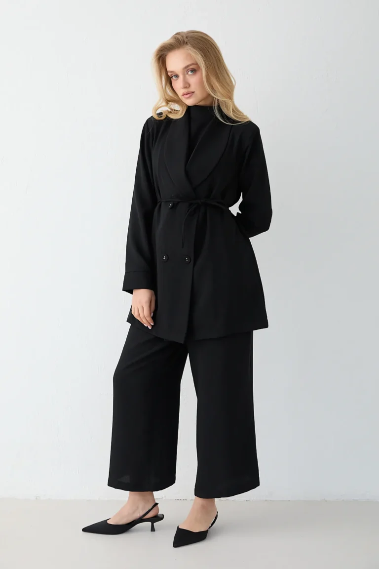 Affirmez votre élégance avec cet ensemble deux pièces noir, mariant une veste longue structurée et une jupe fluide assortie. Conçu pour la femme moderne, ce tailleur offre une allure sophistiquée et une silhouette affinée, idéale pour vos événements formels ou vos tenues de soirée les plus raffinées.