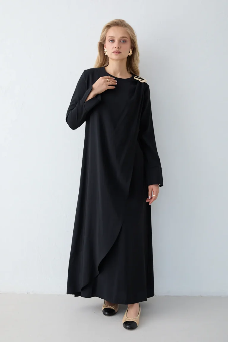 Robe Longue Noire en Modal avec Broche Amovible – Élégance & Fluidité
