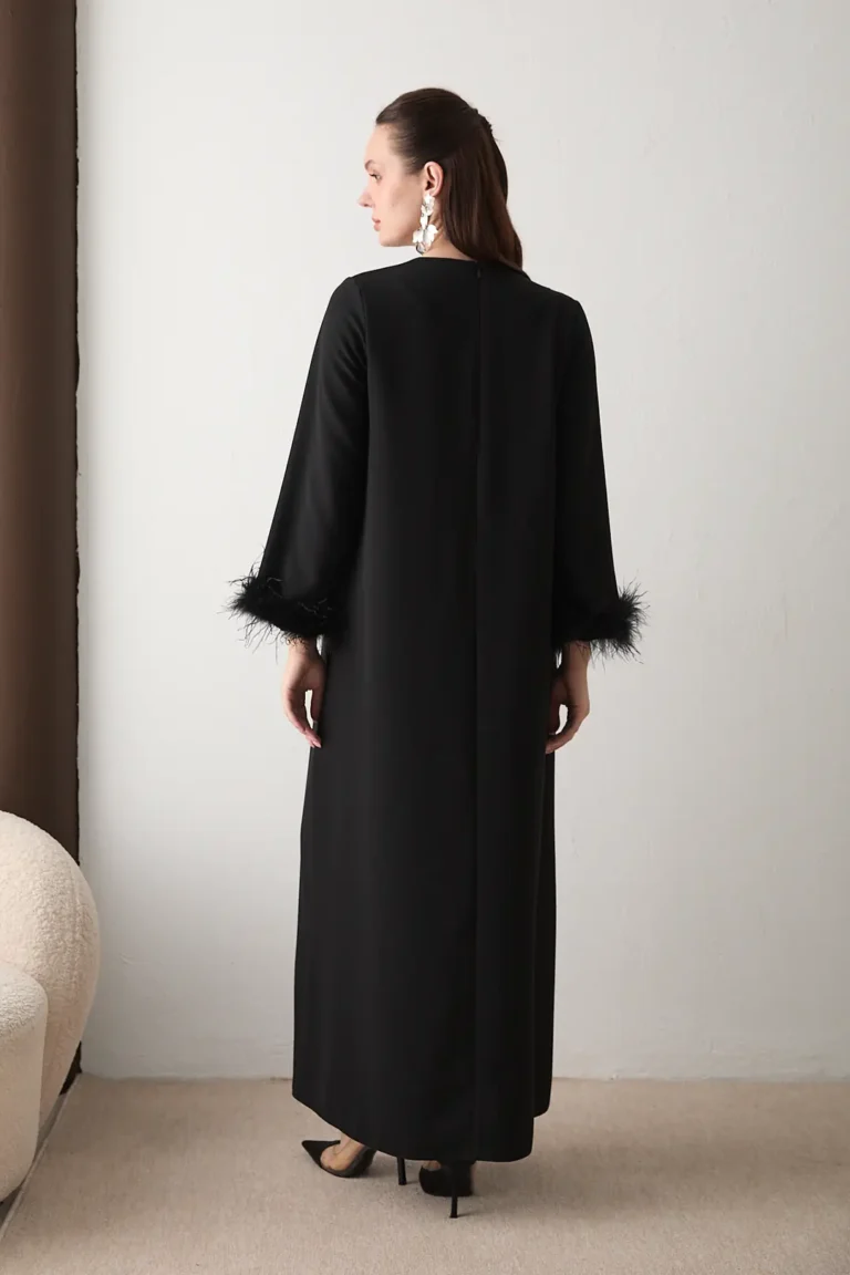 Affirmez votre élégance avec cette robe de soirée moderne au tombé fluide. Conçue en tissu crêpe de haute qualité, elle se distingue par ses finitions raffinées en plumes aux poignets et sa broche amovible, offrant une silhouette sophistiquée idéale pour vos événements prestigieux et cérémonies.