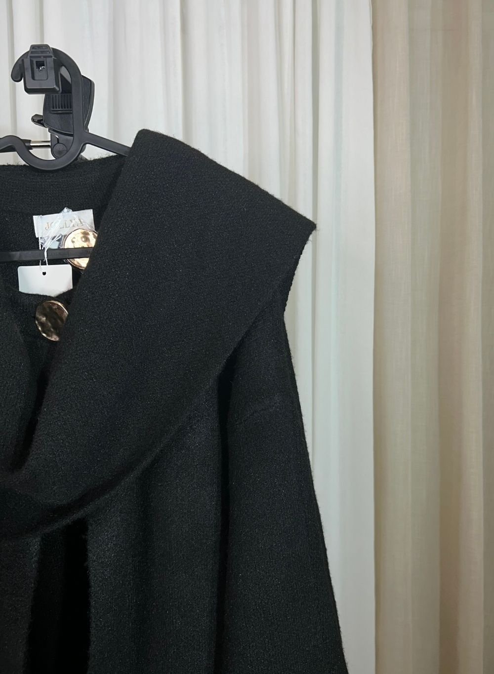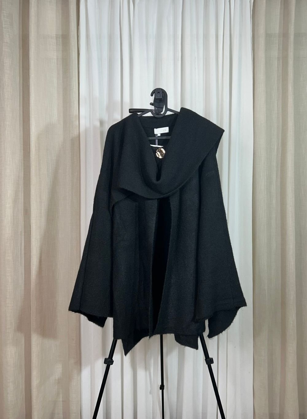 Cape noire en maille douce, coupe ample et col drapé chic — parfaite pour un look élégant et modest fashion.