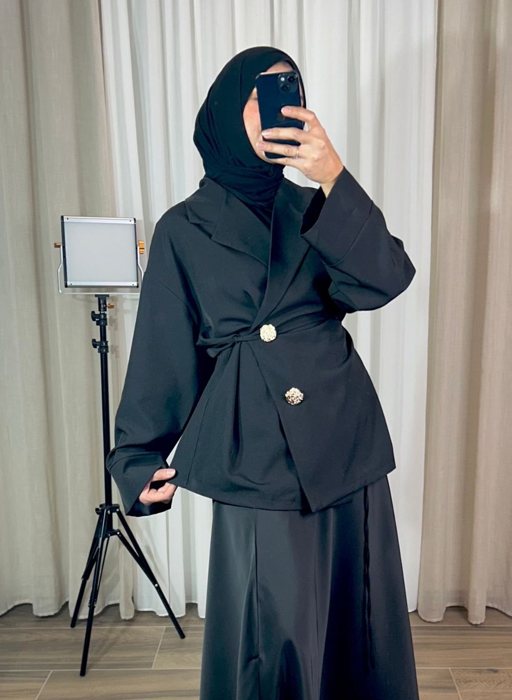 Blaser noire élégante croisée avec boutons bijoux – Coupe premium et style chic modest fashion
