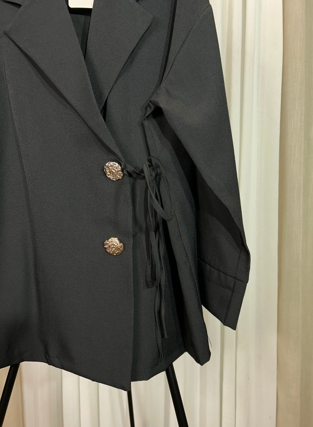 Blaser noire croisée ornée de boutons bijoux dorés, coupe fluide et élégante, parfaite pour des tenues modestes chic et sophistiquées.