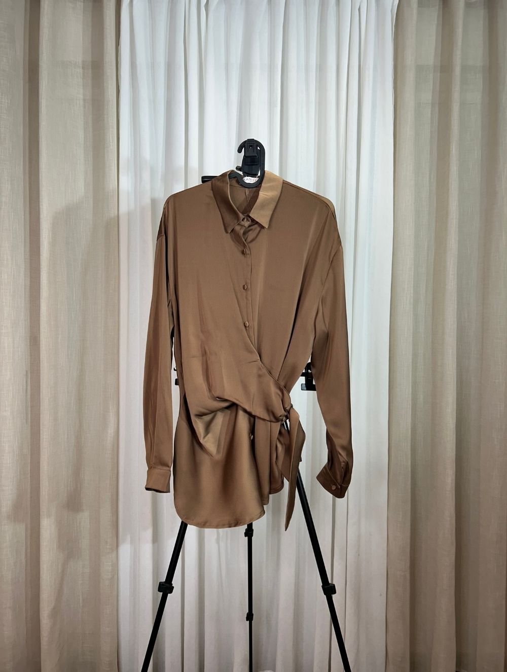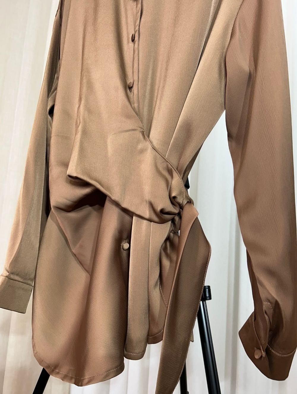 Chemise Satinée Marron – Coupe Élégante avec Nœud Latéral