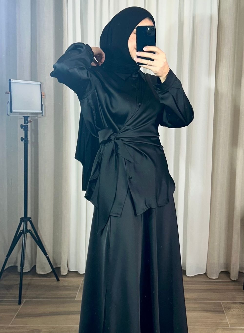 Chemise Satinée Noire à Nouer – Élégance Fluide & Style Modeste