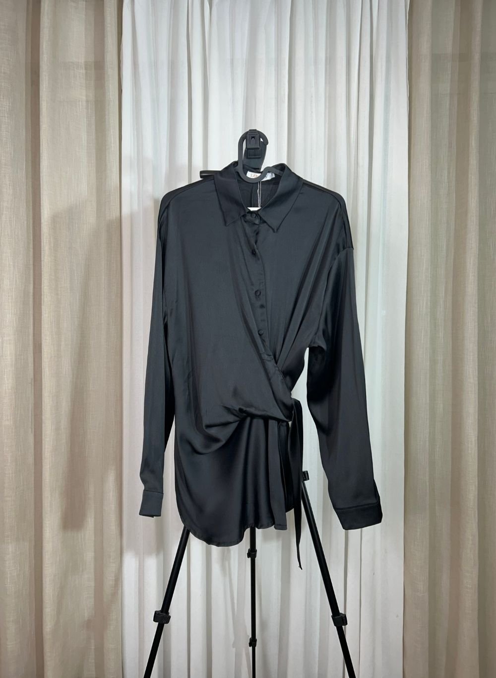 Chemise satinée noire à nouer, coupe fluide et chic, idéale pour un look élégant, habillé ou soirée.