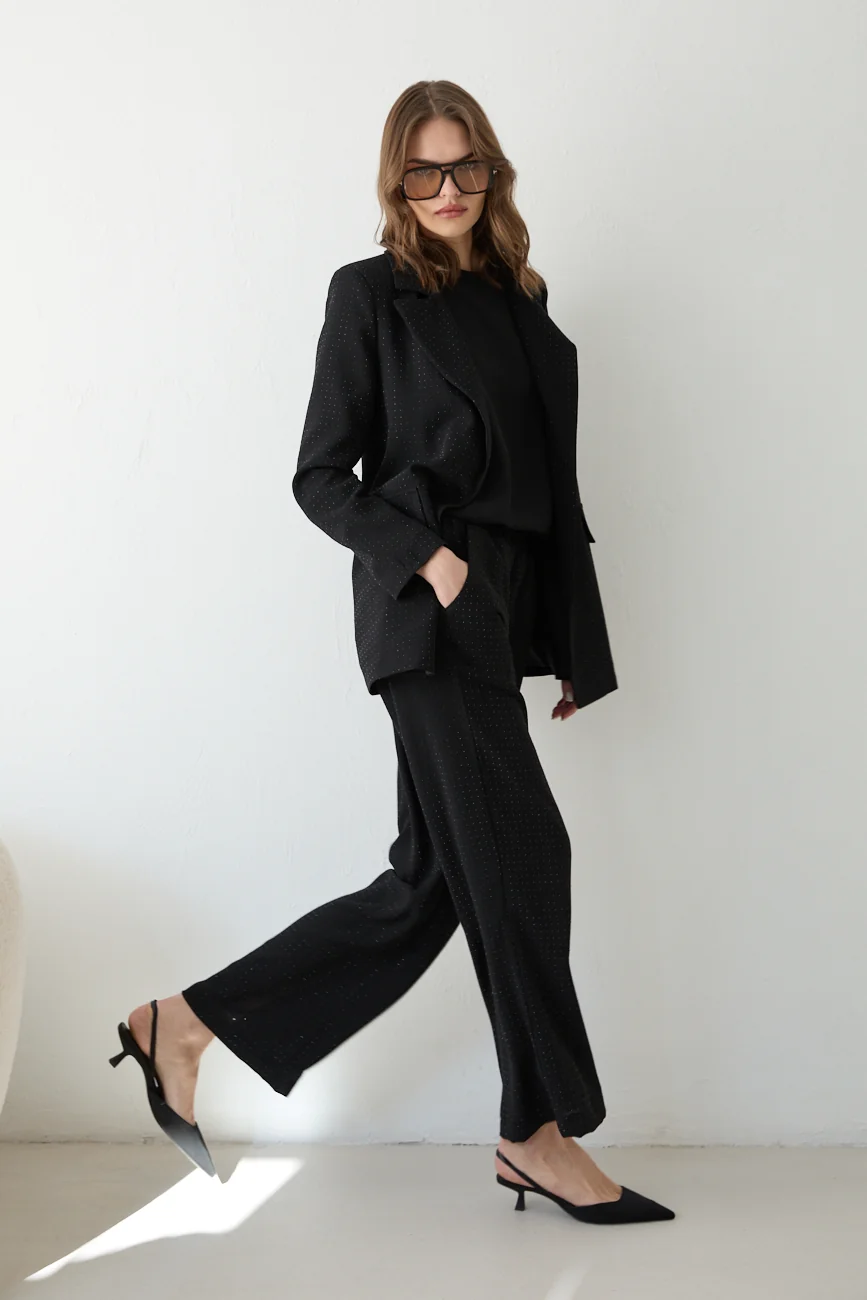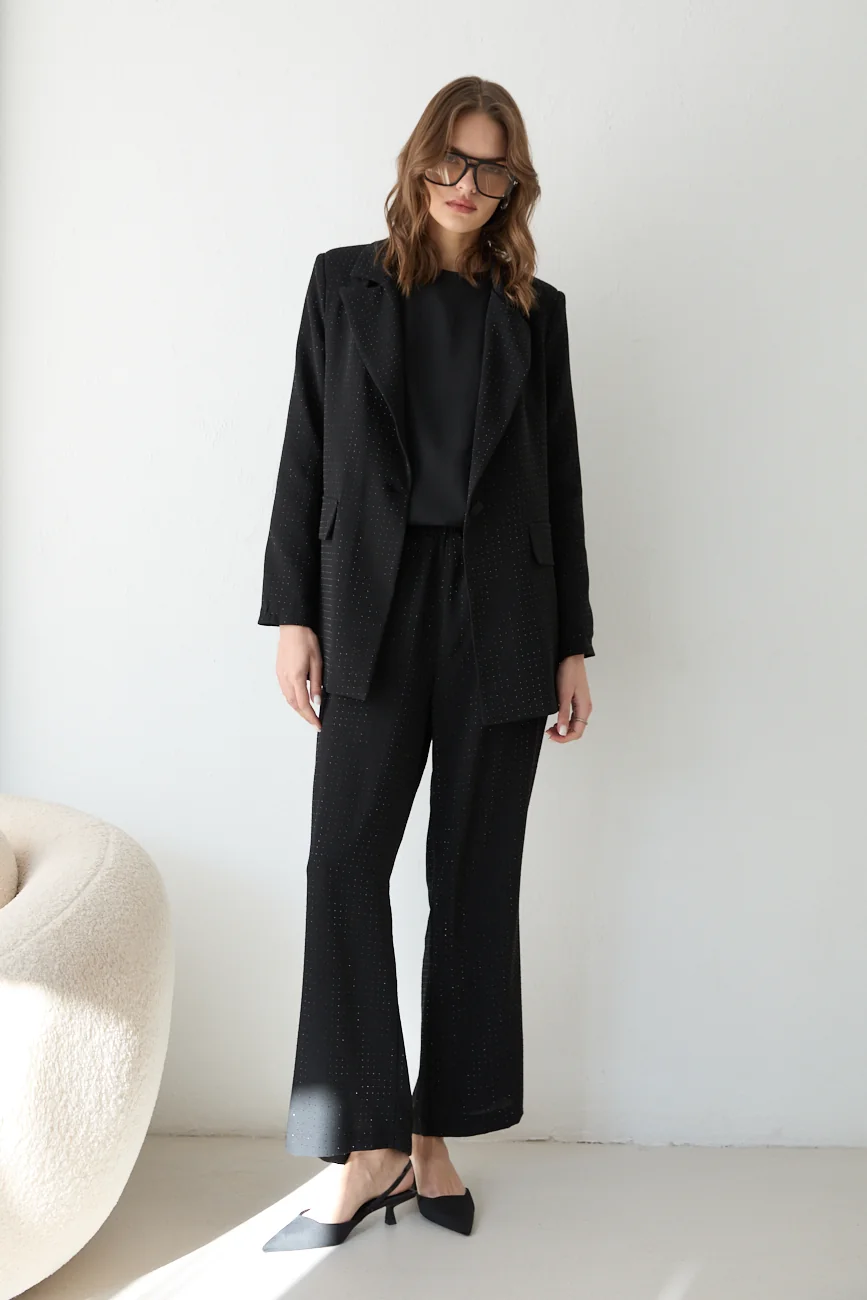 Faites sensation avec cet ensemble tailleur scintillant, entièrement orné de strass pour une allure prestigieuse. Composé d’un blazer structuré à épaulettes et d’un pantalon fluide en crêpe, cet ensemble combine parfaitement l’élégance d’une tenue de soirée et le confort d’une coupe moderne. Un indispensable pour vos événements les plus exclusifs.