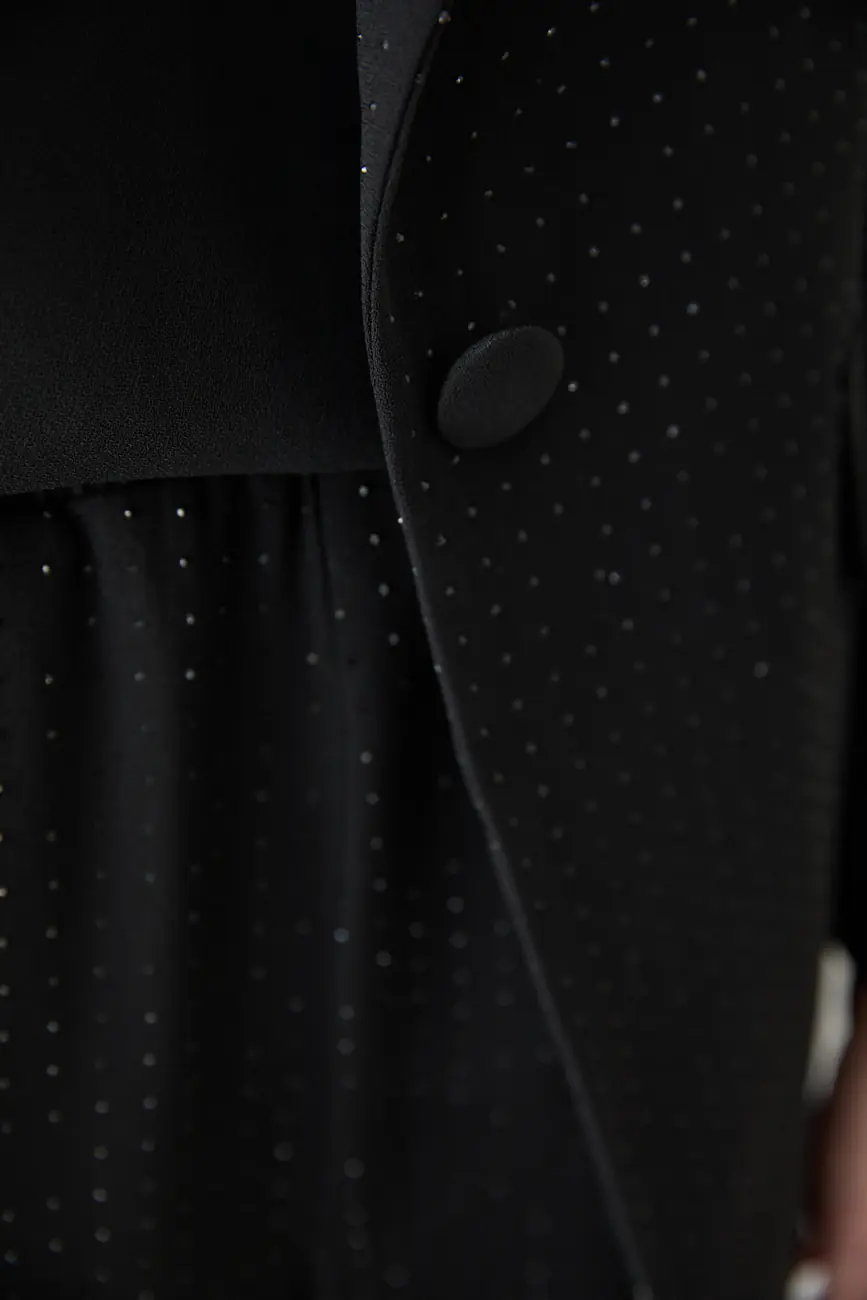 Adoptez une allure affirmée avec cet ensemble de deux pièces conçu pour captiver le regard. Le haut, une veste blazer à bouton unique, offre une structure impeccable grâce à ses épaulettes intégrées et sa doublure soignée. Son design entièrement strassé apporte une brillance incomparable, idéale pour les galas, mariages ou soirées chics.