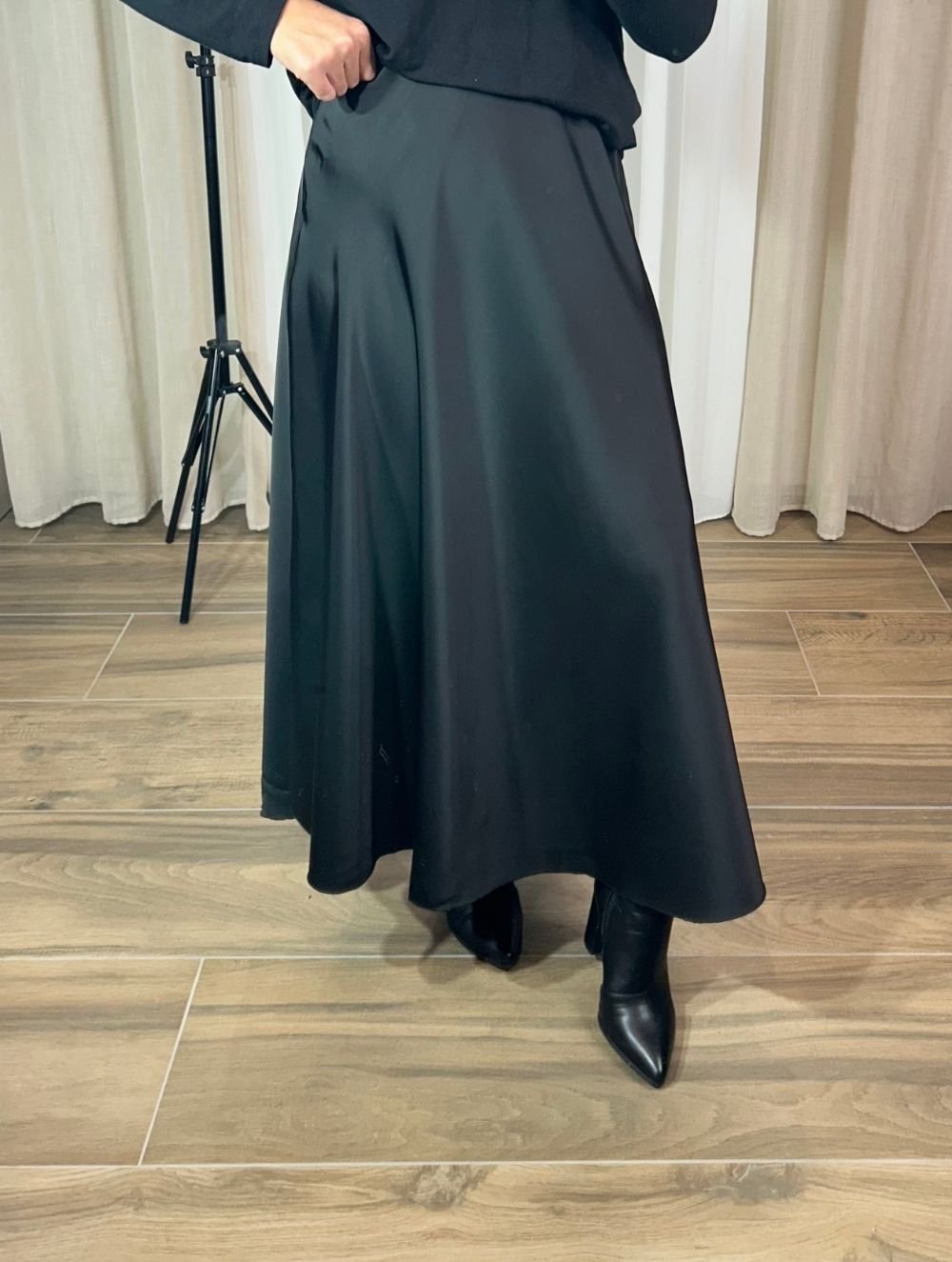 Jupe longue satinée noire, fluide et chic, idéale pour un look élégant et moderne tout en restant parfaitement modeste.