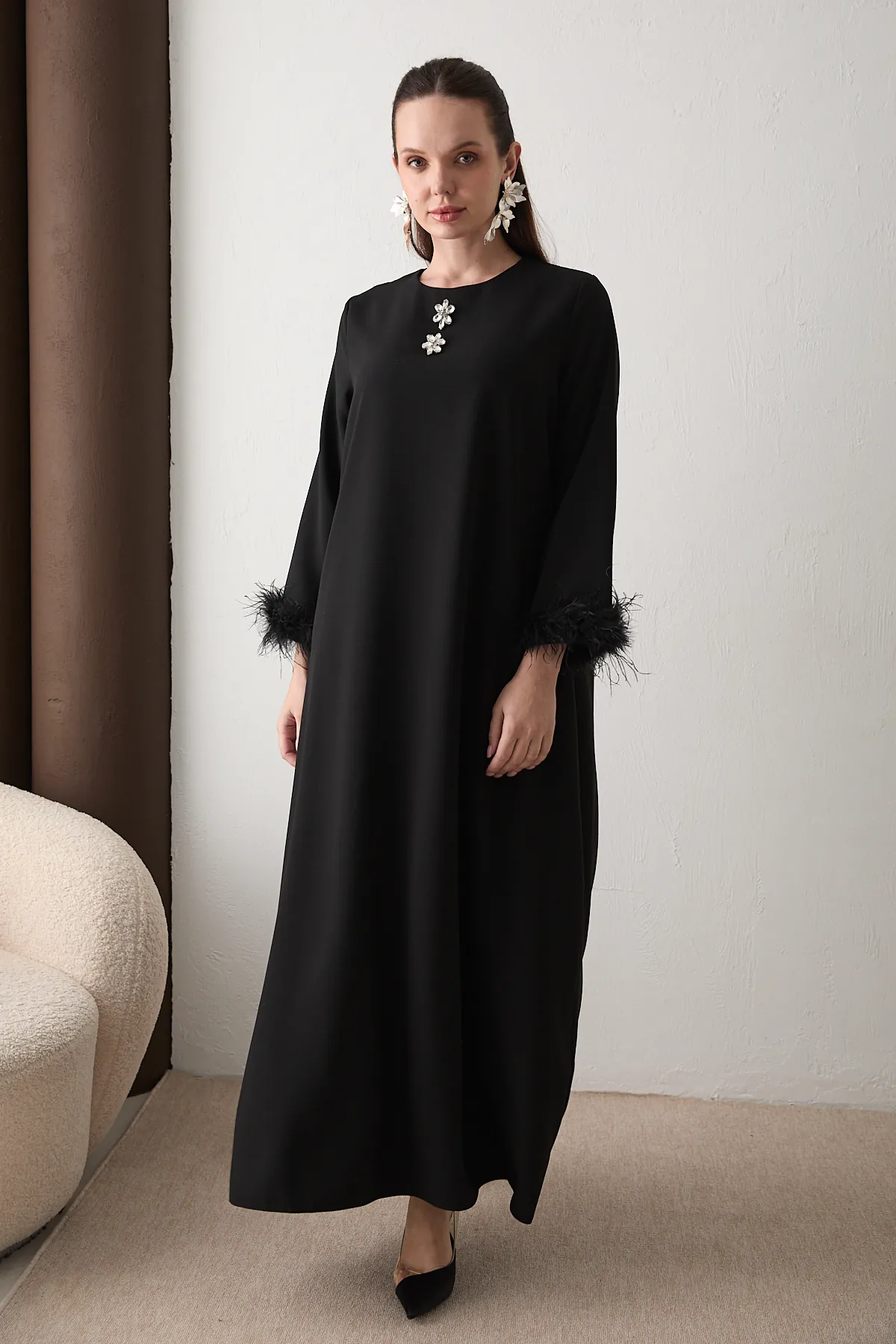 Soyez le premier à laisser votre avis sur “Robe Longue de Soirée en Crêpe Noir – Détails Plumes & Broche Amovible”