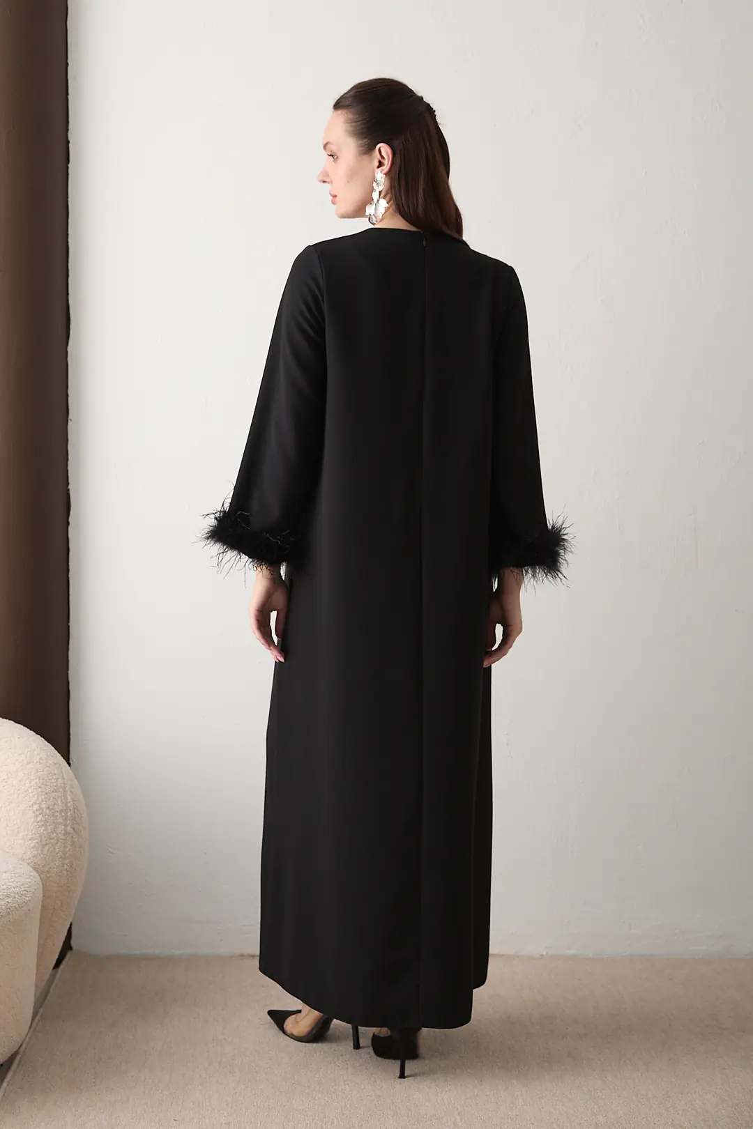 Affirmez votre élégance avec cette robe de soirée moderne au tombé fluide. Conçue en tissu crêpe de haute qualité, elle se distingue par ses finitions raffinées en plumes aux poignets et sa broche amovible, offrant une silhouette sophistiquée idéale pour vos événements prestigieux et cérémonies.